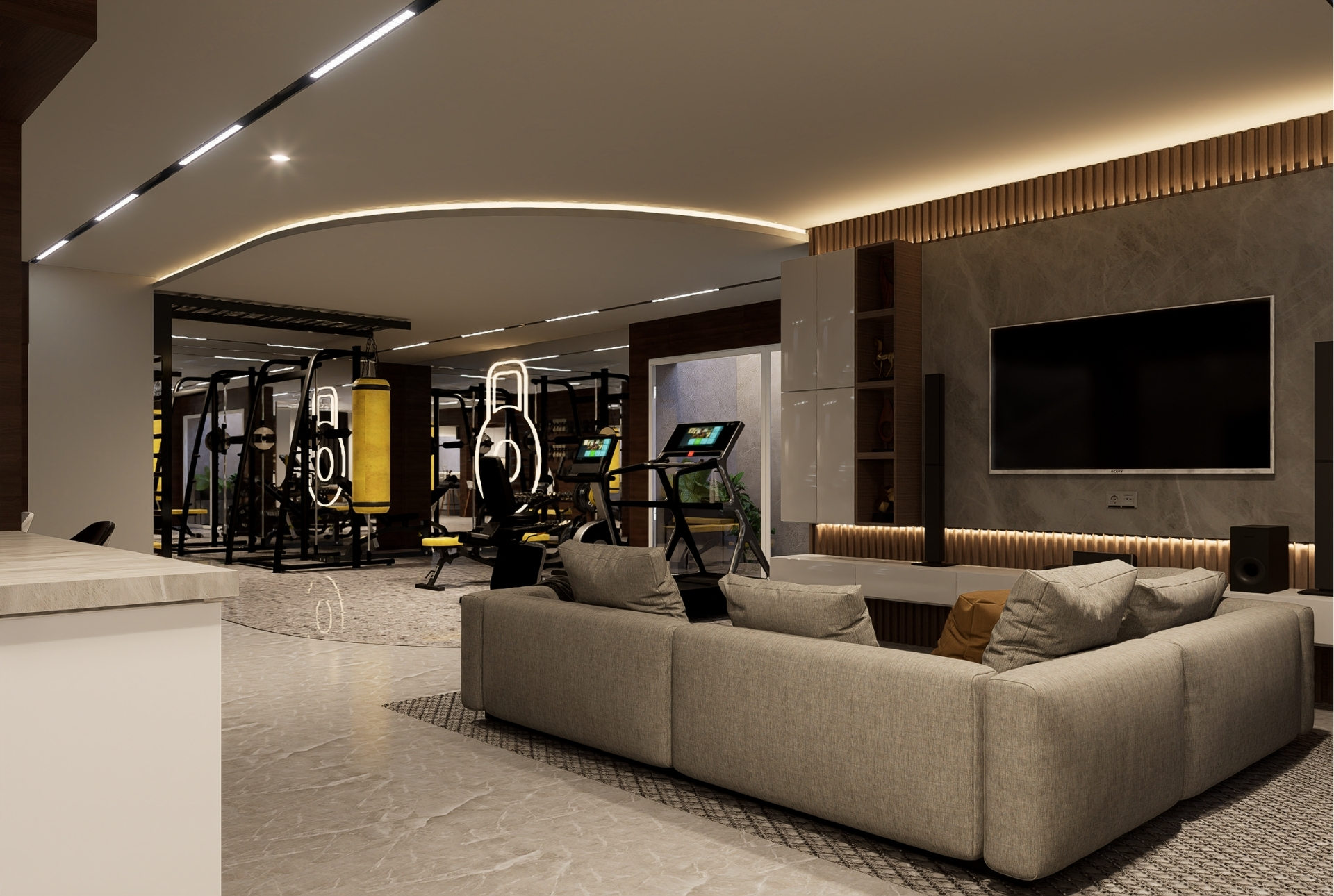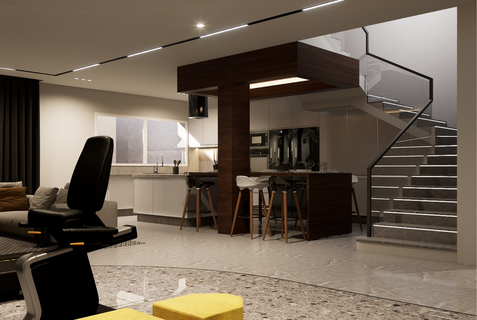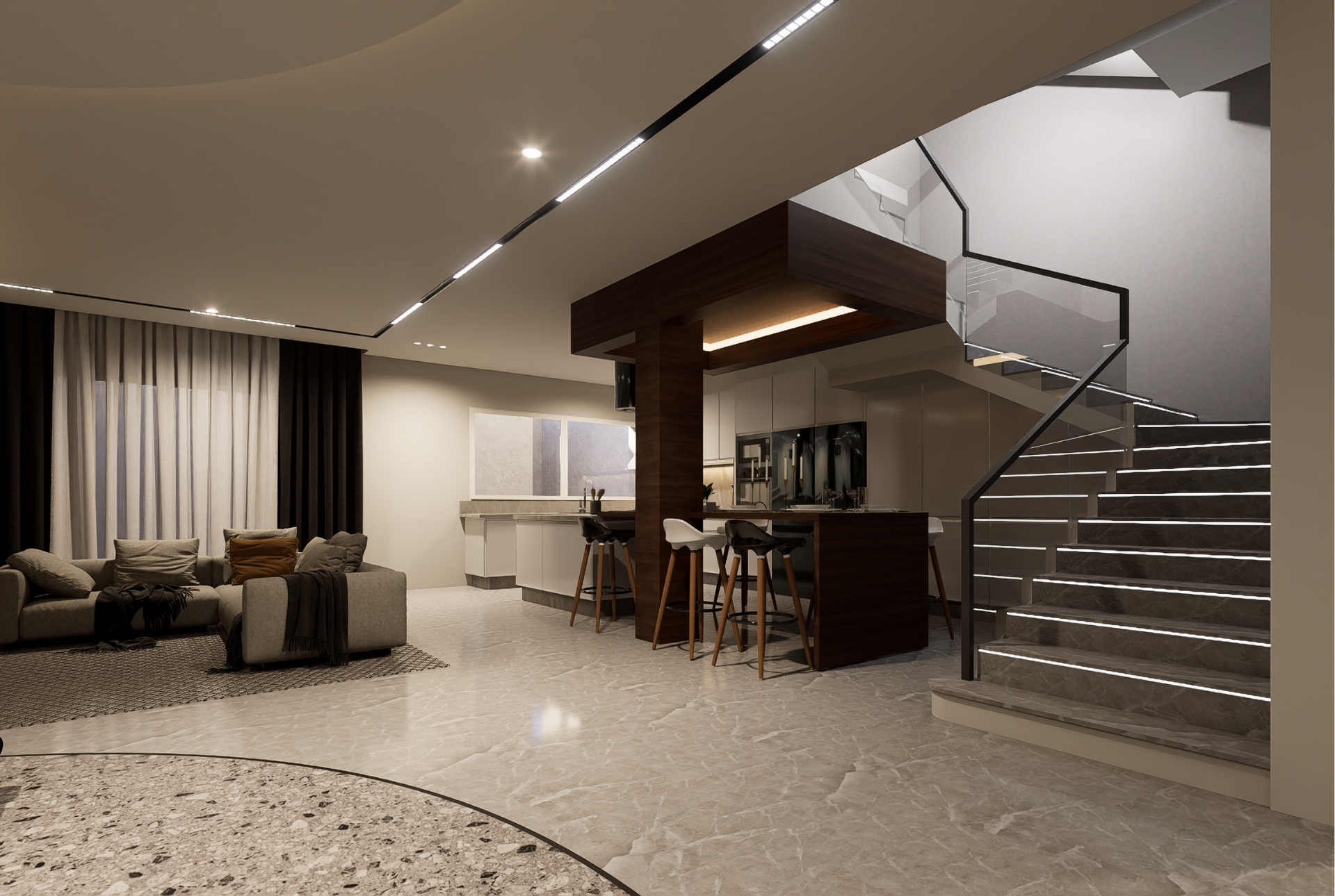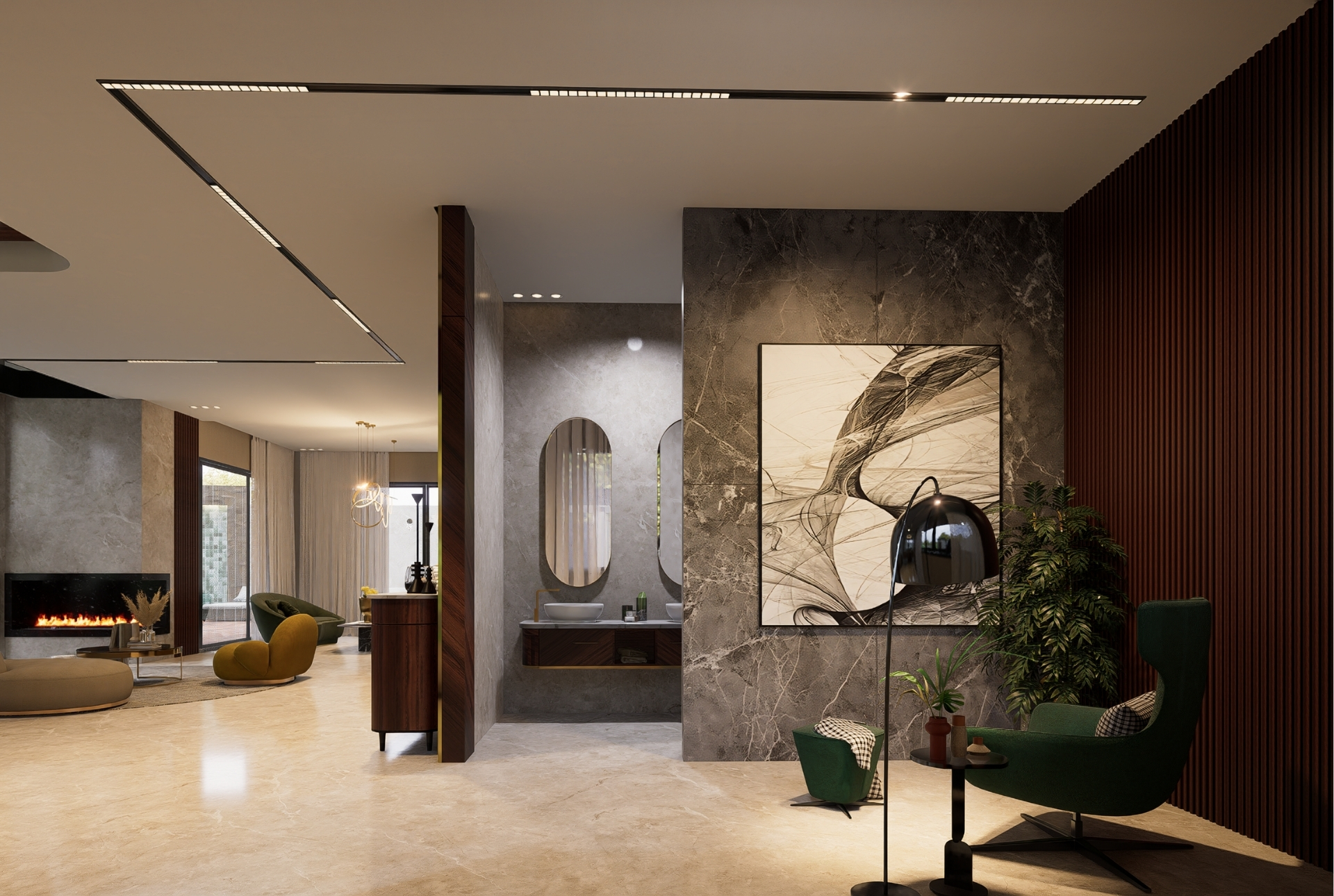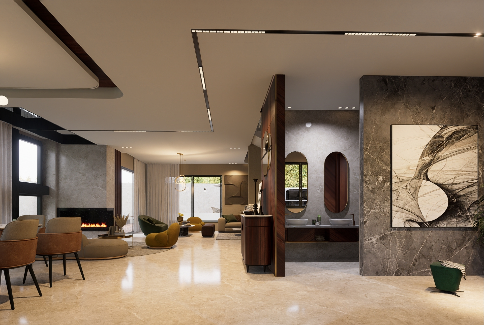 Le projet se distingue par une architecture intérieure épurée, des matériaux nobles (bois, pierre naturelle, métal noir), et une circulation fluide entre les espaces. Chaque zone – du salon à double hauteur jusqu’à l’espace massage – a été pensée pour créer une expérience de vie harmonieuse.