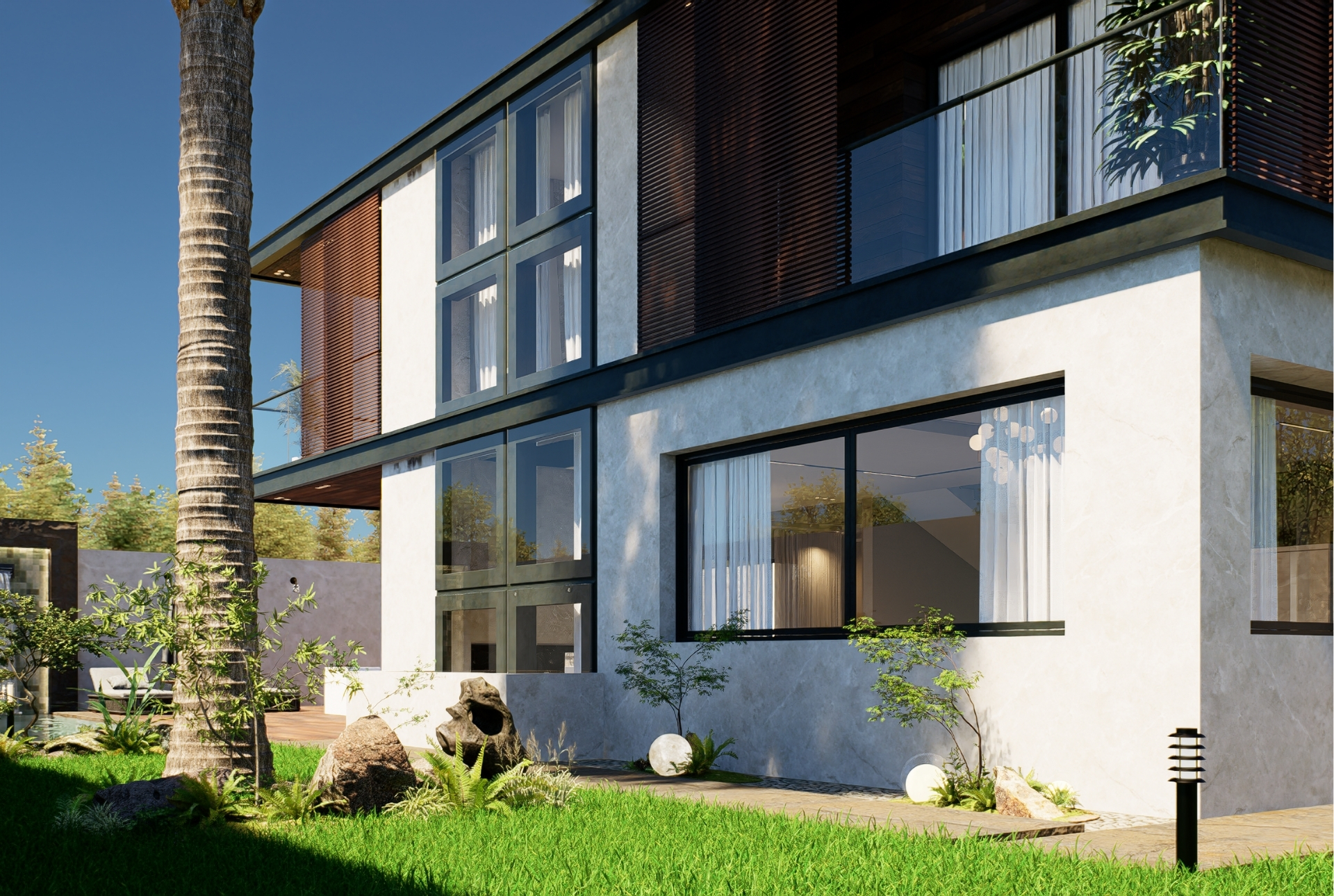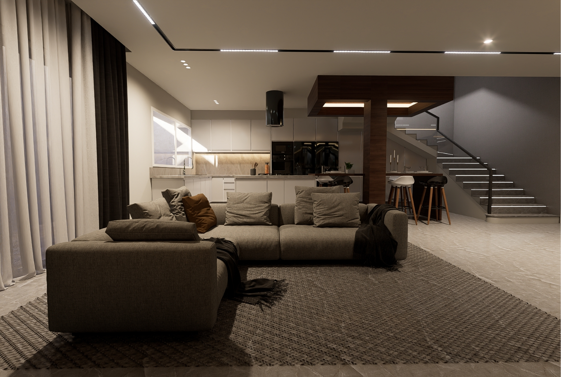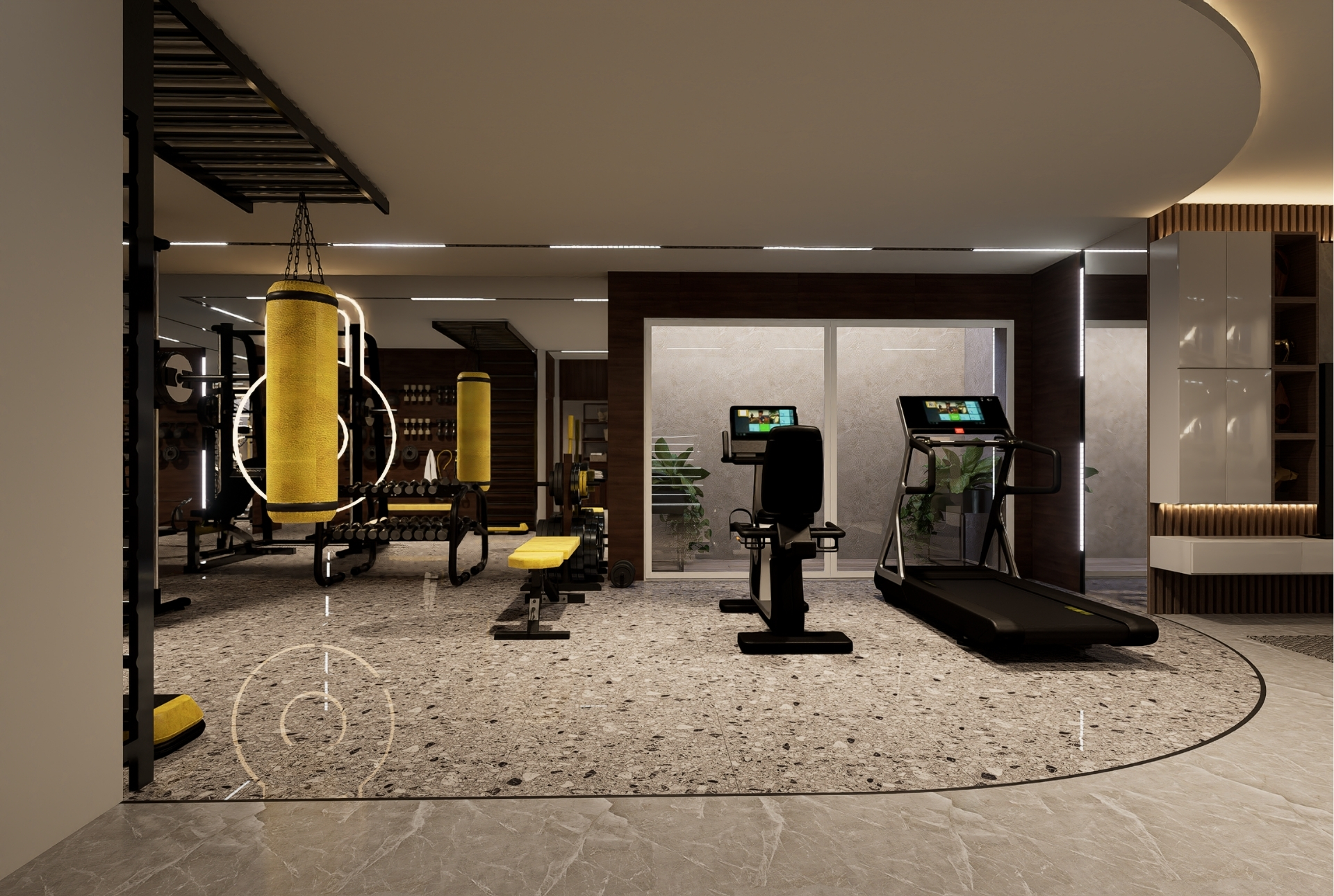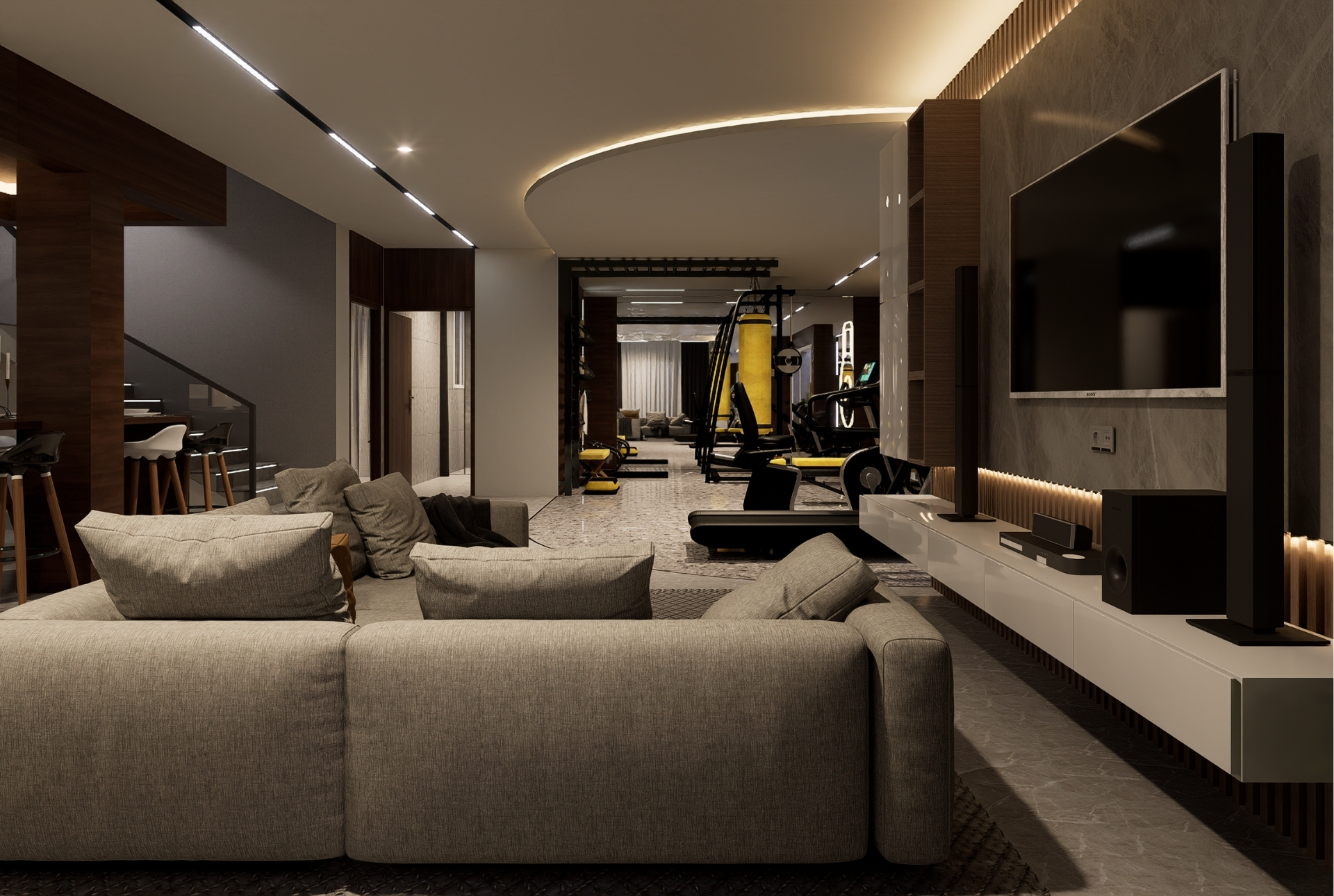 Le projet se distingue par une architecture intérieure épurée, des matériaux nobles (bois, pierre naturelle, métal noir), et une circulation fluide entre les espaces. Chaque zone – du salon à double hauteur jusqu’à l’espace massage – a été pensée pour créer une expérience de vie harmonieuse.