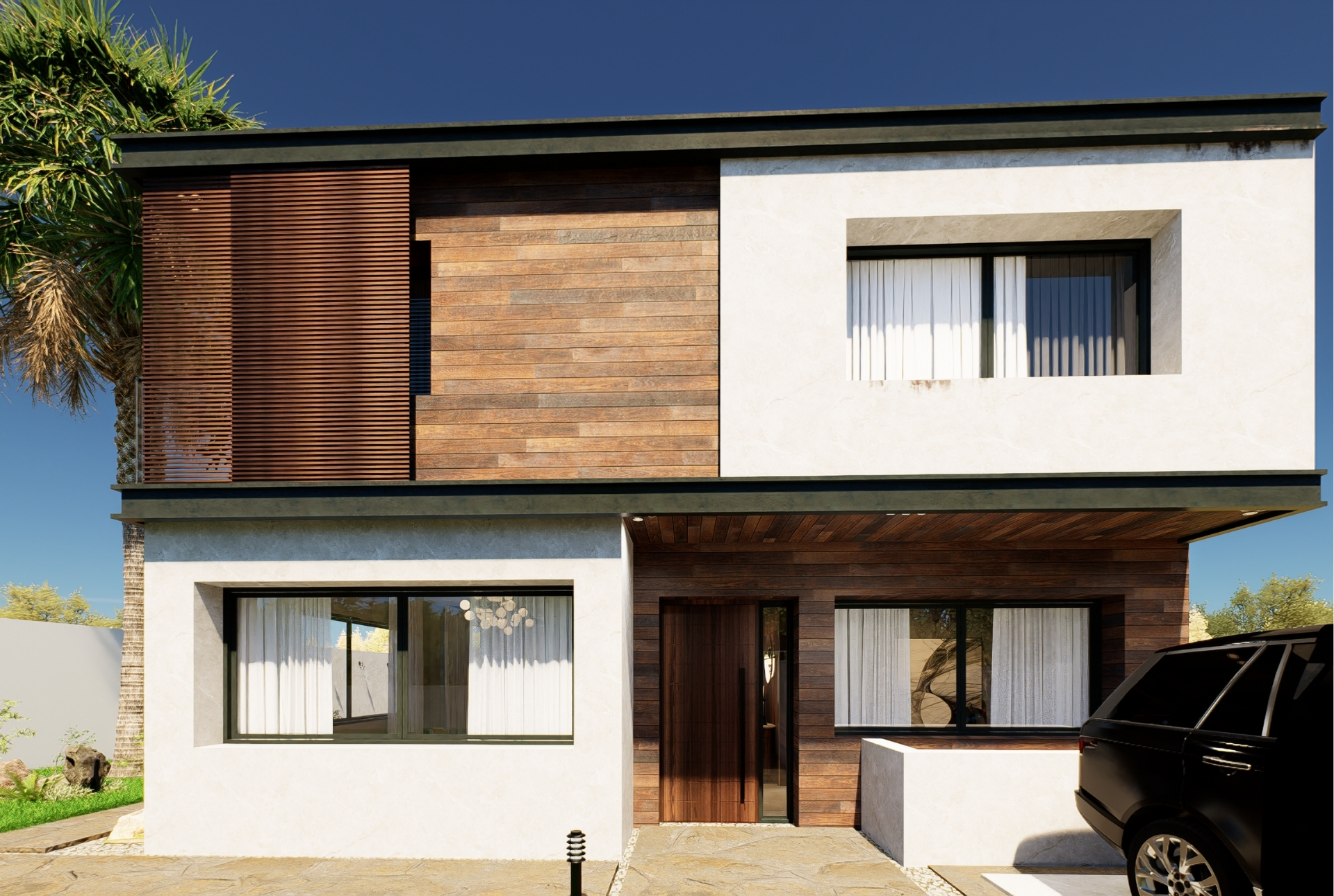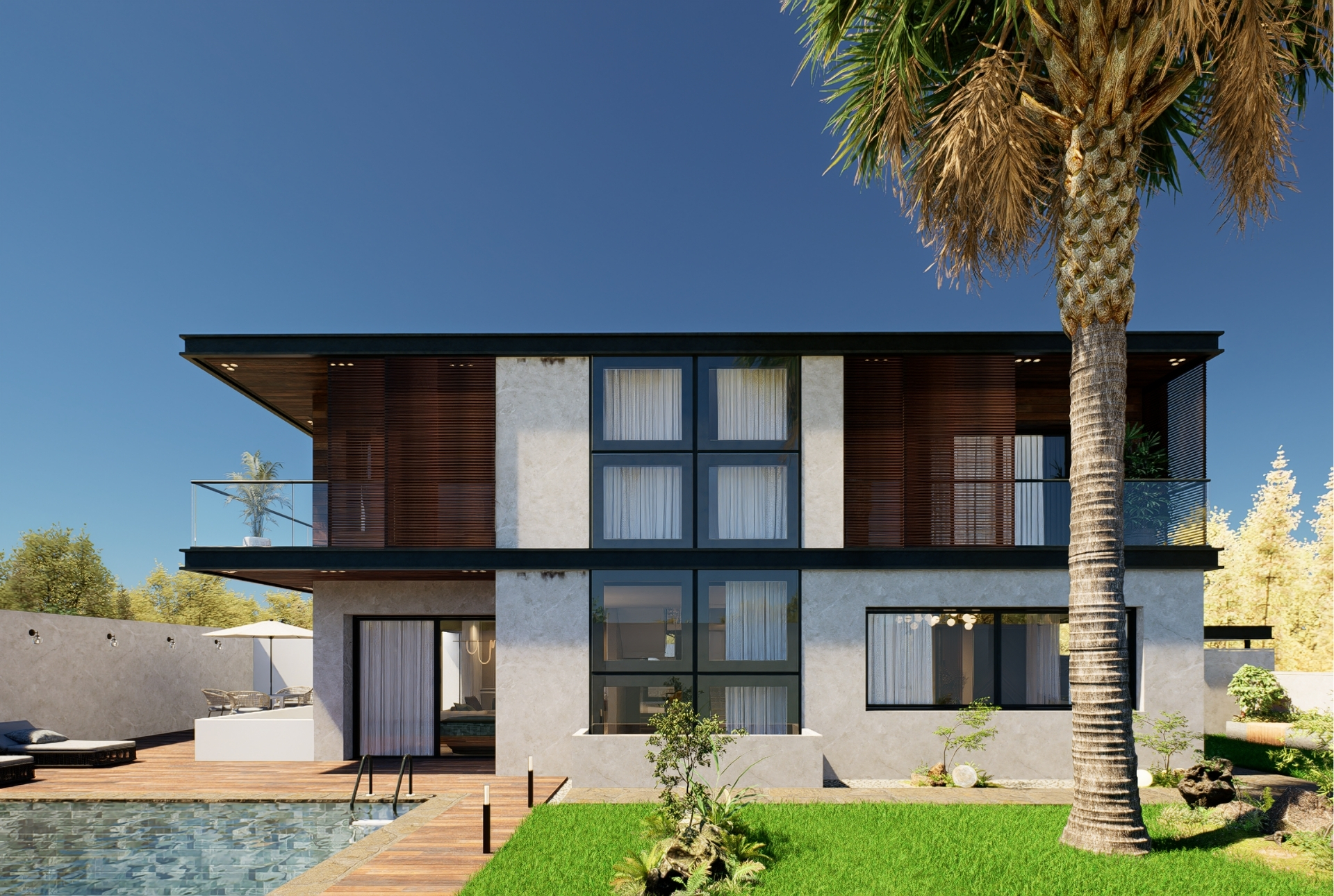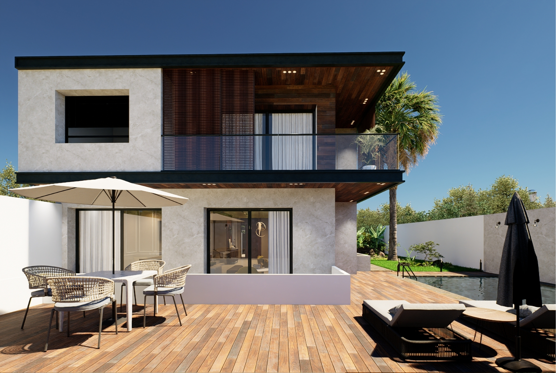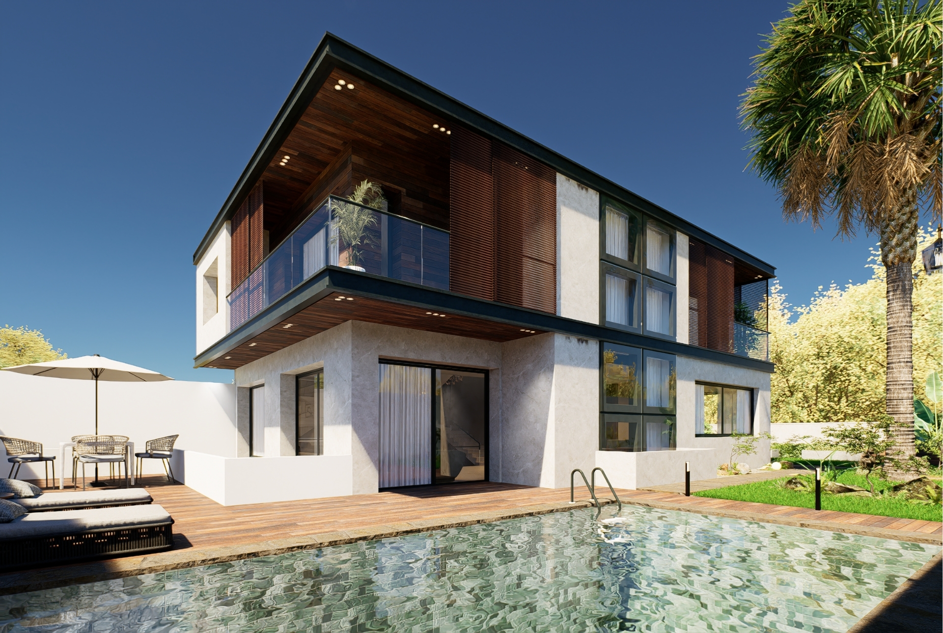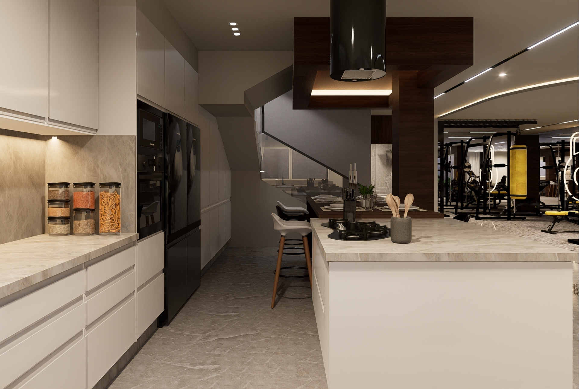 Le projet se distingue par une architecture intérieure épurée, des matériaux nobles (bois, pierre naturelle, métal noir), et une circulation fluide entre les espaces. Chaque zone – du salon à double hauteur jusqu’à l’espace massage – a été pensée pour créer une expérience de vie harmonieuse.